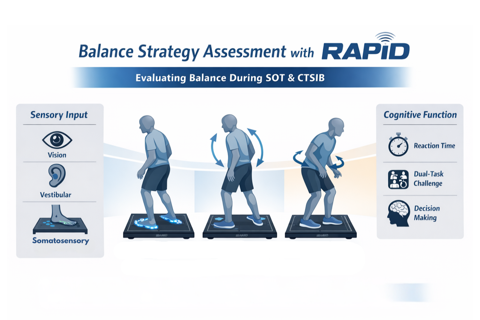 RAPID also utilizes the gold standard of balance assessment—force and pressure sensing technology(the RAPID Gravity Mat) to objectively measure:
